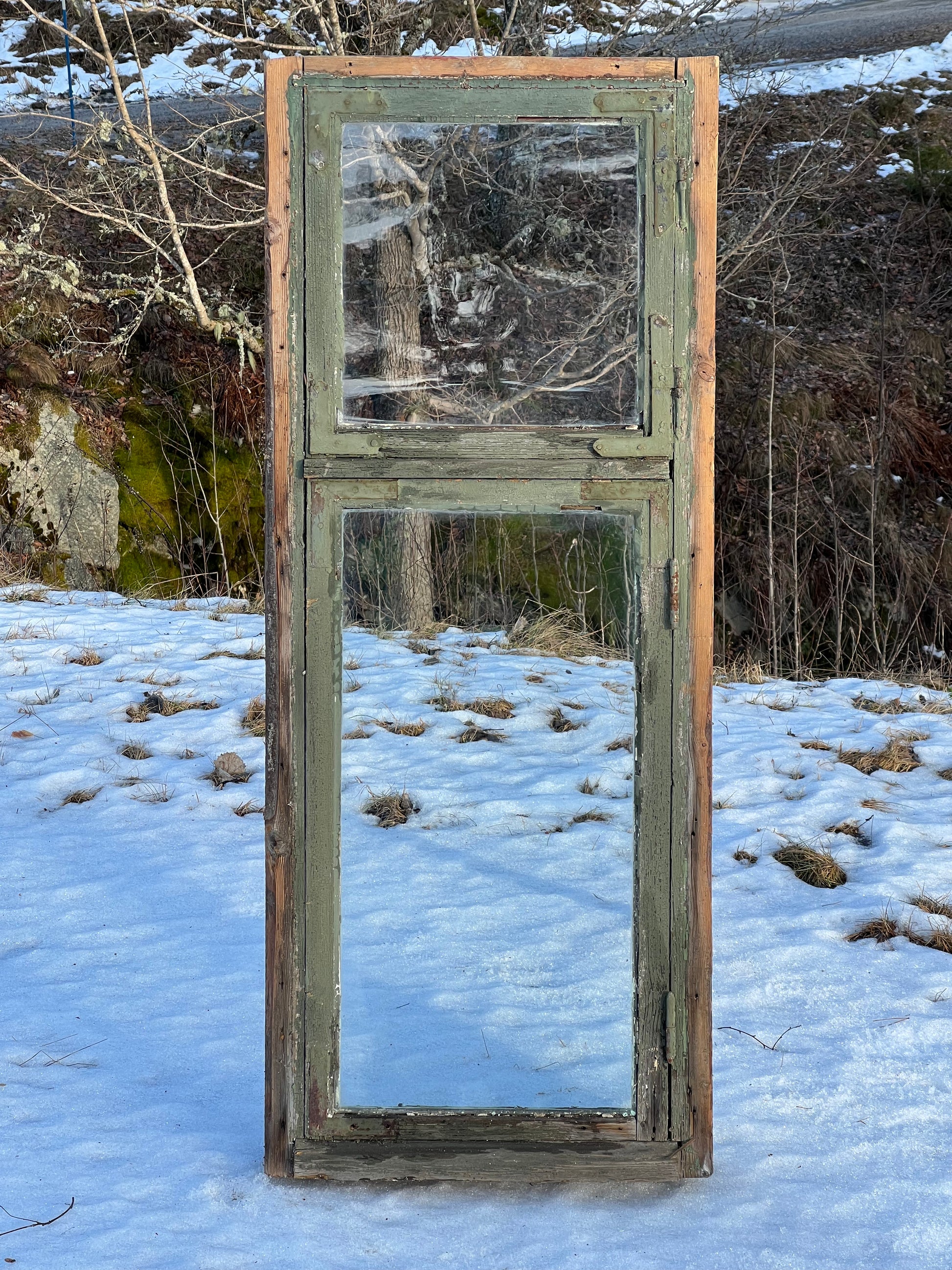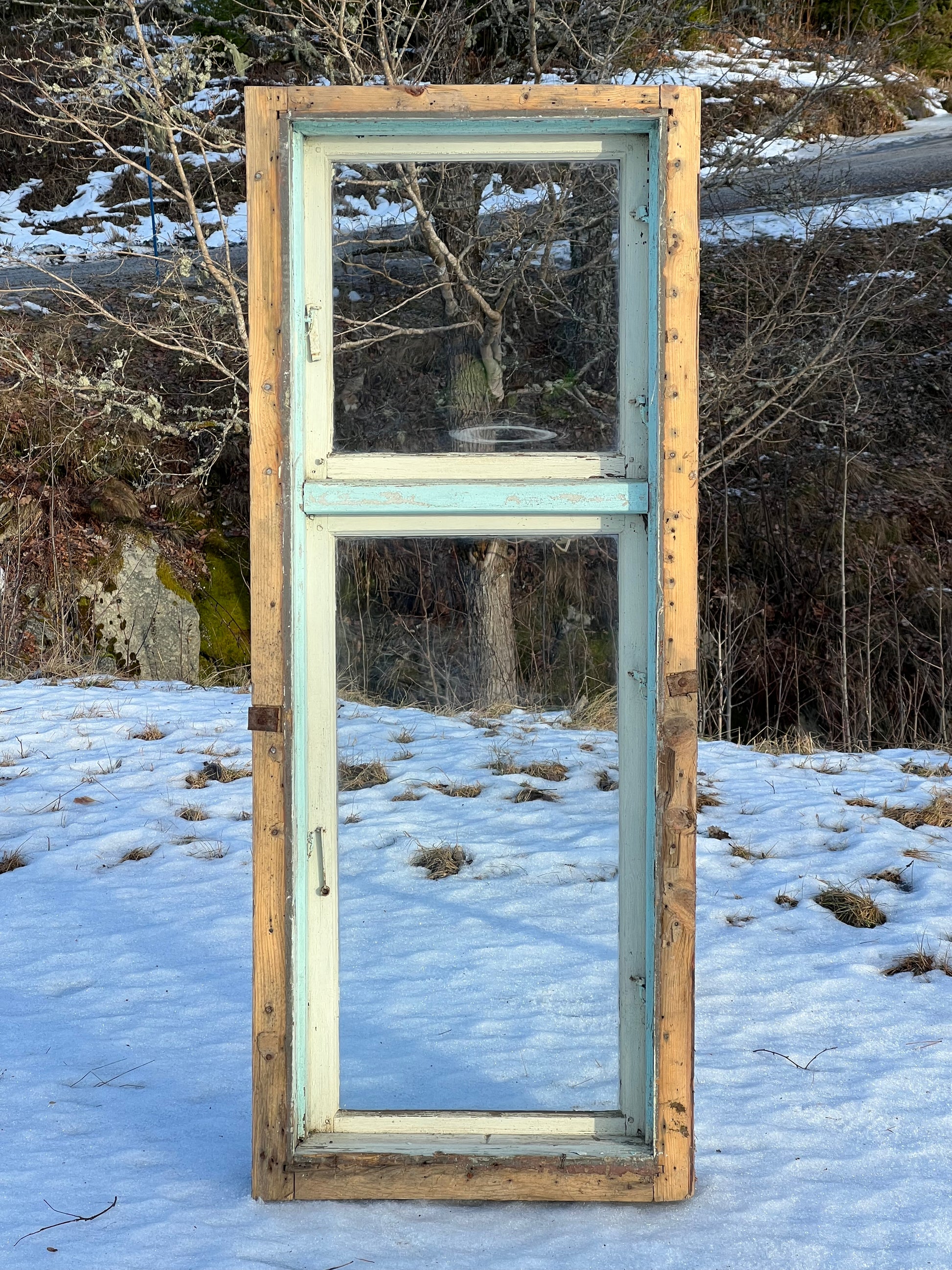 Med innanfönster. Karmyttermått 145x58 cm.