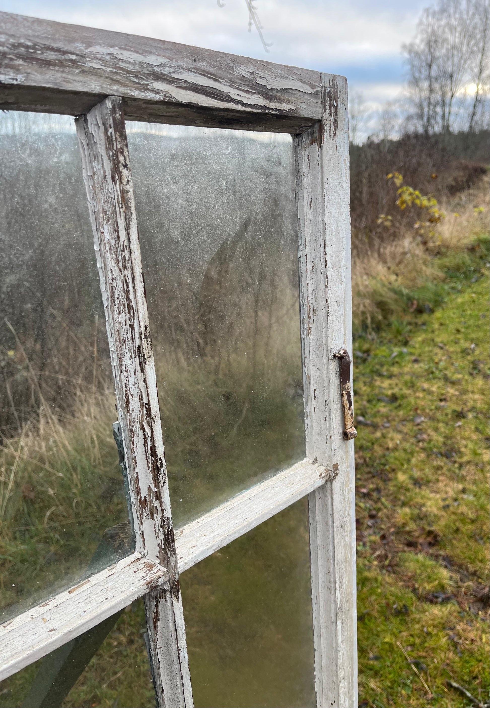 Fönsterbåge med munblåst glas. Där glas är skadat eller fattas ingår tillskuret munblåst glas.