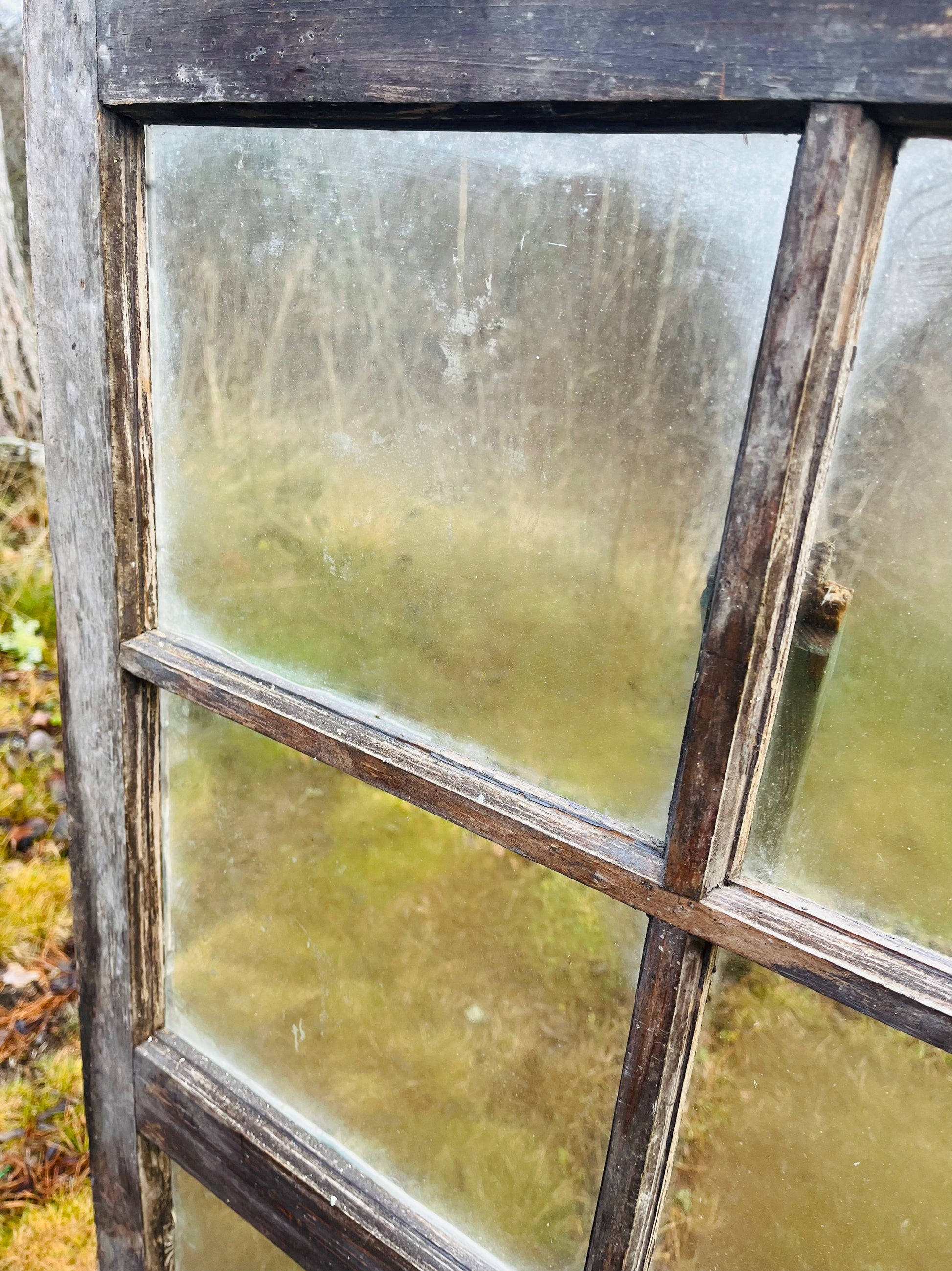 Fönsterbåge med munblåst glas. Där glas är skadat eller fattas ingår tillskuret munblåst glas.